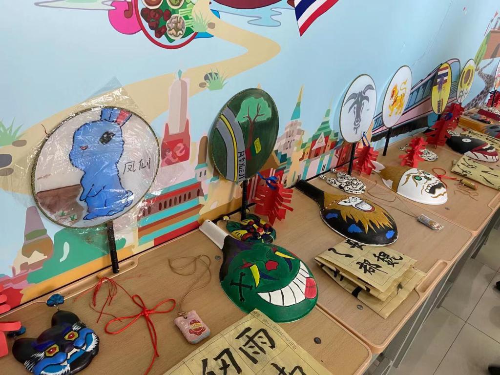 在学生艺术学习成果展示环节,泰国学生在日常教学实践,制作了大量中国文化艺术作品,此次要求每人挑选精品,集中展示并讲解了自己的作品,其中有精巧的刺绣手工艺品;有象征吉祥如意的中国结;有艺术感强烈的马勺脸谱,在师生愉悦的考核交流中,泰国留学生对中国文化的认同喜爱溢于言表;在中国传统文化参观体验环节,在中国艺术课程团队教师带领下,泰国学生参观了基础部中国传统文化传承基地文化长廊,学生们在参观过程中,对悠久历史、灿烂文化、非遗传承模块表现出强烈的兴趣,部分学生结合中国游览经历,谈论对中国旅游文化及传统手工技艺的感受。