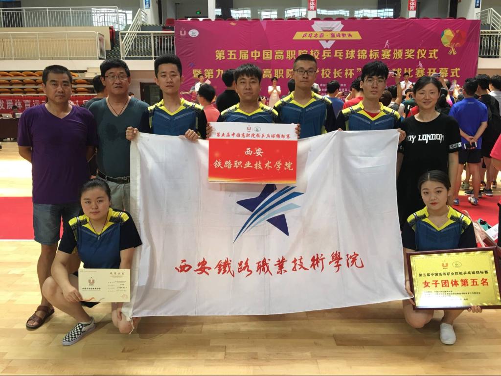 2018年7月18日-21日,由中国大学生体育协会主办、山东科技职业学院承办的第五届中国高等职业院校乒乓球锦标赛在山东潍坊举行。 我院乒乓球代表队在白静教授带领下,在张建龙、罗铁华、刘娜、高峰老师的精心指导下,以顽强的毅力,拼搏的精神和精湛的球艺过关斩将、力克群雄,冲入前八强,获得女子团体第五的佳绩。刘娜老师获“优秀教练员”称号。