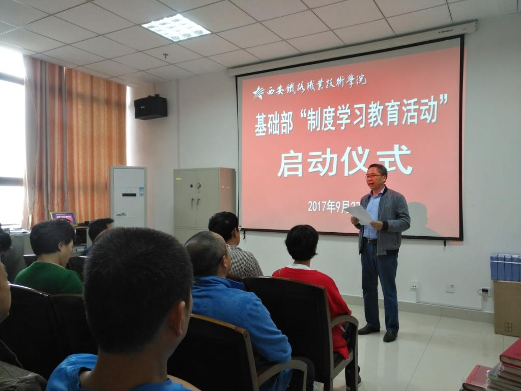 为进一步组织基础部全体教职员工加强学习,增强政治纪律和政治规矩意识,加强基础部执行力建设,创建良好的懂规矩守制度工作氛围,基础部决定开展“制度学习教育活动”,并以此为契机,进一步增强基础部学习氛围,提升基础部创新理念,9月27日下午基础部进行了“制度学习教育活动”启动仪式,各教研室主任及教师代表参加了启动仪式。